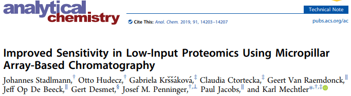 Johannes Stadlmann, Otto Hudecz, Gabriela Krššáková, Claudia Ctortecka, Geert Van Raemdonck, Jeff Op De Beeck, Gert Desmet, Josef M. Penninger, Paul Jacobs, and Karl Mechtler. “Improved Sensitivity in Low-Input Proteomics Using Micro-Pillar Array-Based Chromatography.” Analytical Chemistry, October 15, 2019. https://doi.org/10.1021/acs.analchem.9b02899.