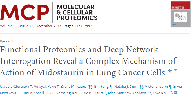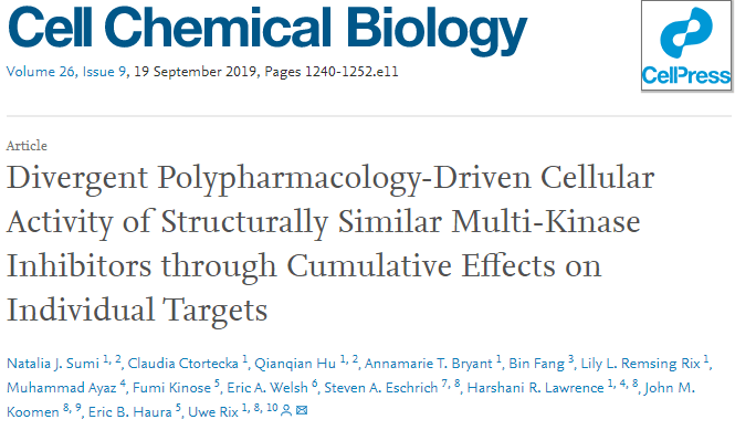 Natalia J. Sumi, Claudia Ctortecka, Qianqian Hu, Annamarie T. Bryant, Bin Fang, Lily L. Remsing Rix, Muhammad Ayaz, “Divergent Polypharmacology-Driven Cellular Activity of Structurally Similar Multi-Kinase Inhibitors through Cumulative Effects on Individual Targets.” Cell Chemical Biology 26, no. 9 (September 19, 2019): 1240-1252.e11. https://doi.org/10.1016/j.chembiol.2019.06.003.